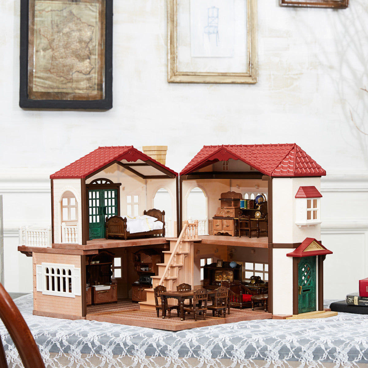 The Classic Color Red Roof Country Home is the Hopscotch Rabbit Family’s beautiful home! This limited edition, web exclusive house is tudor style with unique, rich colors including a deep maroon roof, brown trim and green doors and shutters. House lights up with 3 lamps, each of which can be turned on and off. The home can be opened for play at 90-degrees, 180-degrees, and any angle in-between. Home also closes for more play options and easy storage. A second floor room and the roof piece are removable. Stack the rooms to create 3 levels. The Classic Color Red Roof Country Home connects to Red Roof Cozy Cottage (sold seperately) to create a Grand Mansion.